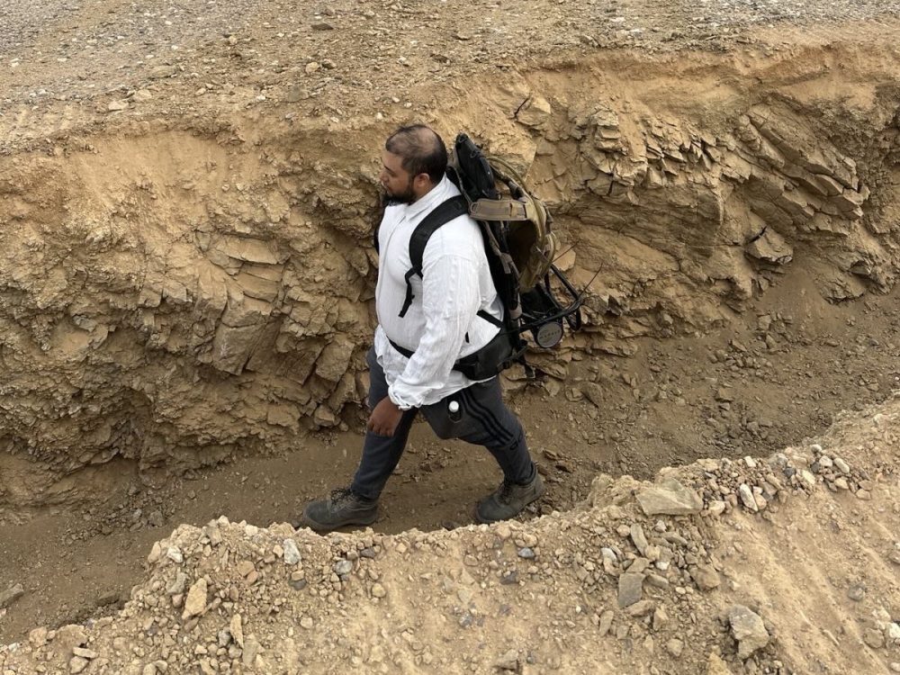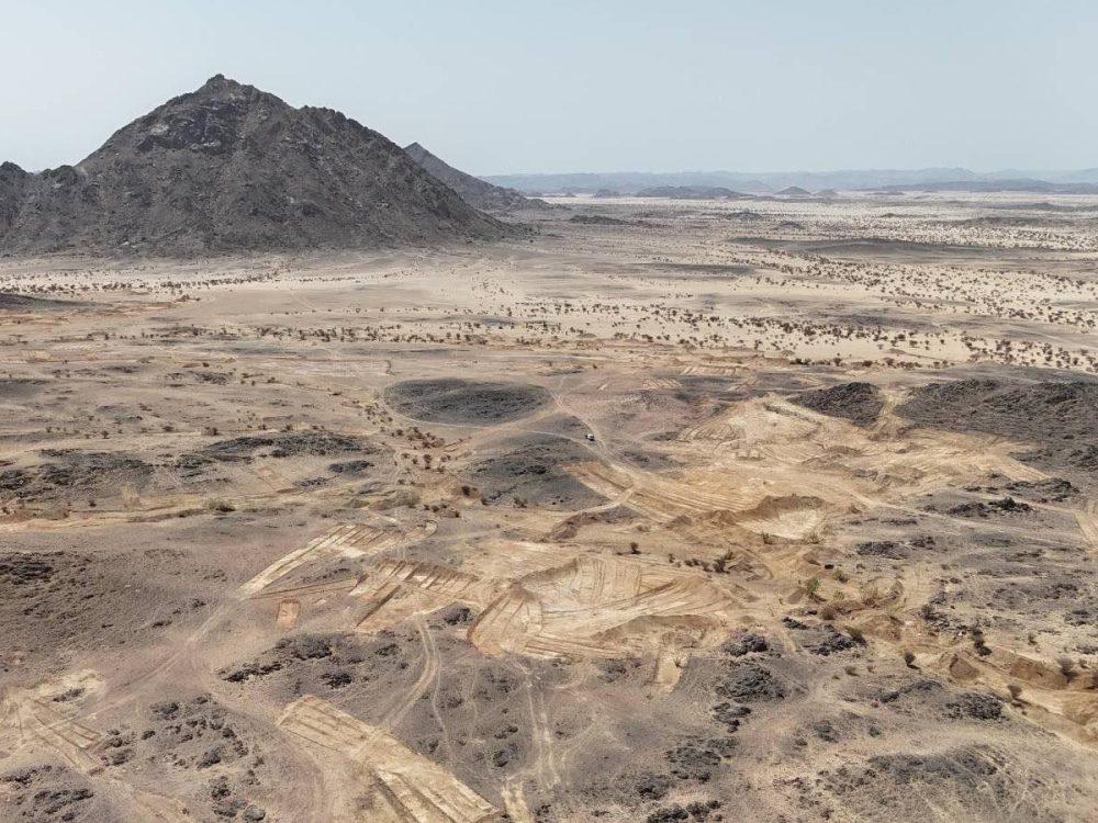 Aerial photograph of the Ash Shajjah gold prospect area. Bulldozer scrapes are by artisanal miners who then scan cleared areas with gold detectors. Running radiometrics along trenches!