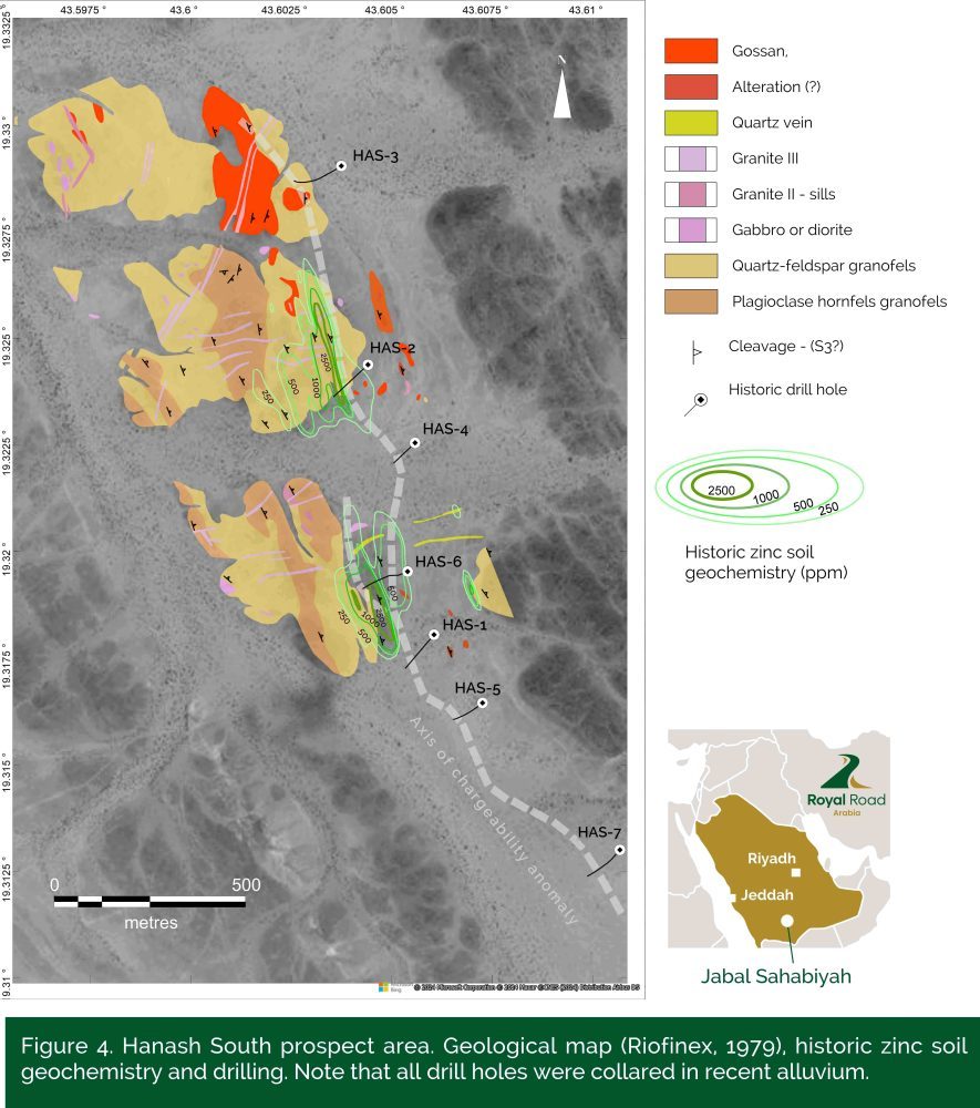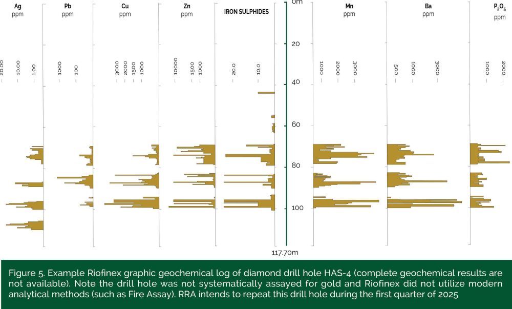 The Hanash South prospect area was discovered by Riofinex in the late 1970’s. Riofinex identified copper, zinc and silver mineralized gossans outcropping and sub-cropping along and within a wadi over a strike distance of approximately 1.6 kilometers (see Figure 4). Riofinex completed ground magnetics, induced polarization (IP) and self-potential (SP) surveys at Hanash South. The IP survey outlined an approximately 2.3-kilometer-long chargeability anomaly located beneath alluvial sediments (see Figure 4). Riofinex drilled seven diamond drill holes along the trend of the IP anomaly. All drill holes except for HAS-3 and 6, intersected (“layer-parallel”) sulphide intervals of from 25 to 90 meters thickness (see example log in Figure 5). The sulphide sections were anomalous in silver, zinc and copper. Some select samples were taken for gold analyses, but results were not reported. Estimated grades assessed from graphic logs (historic results are not available; see Figure 5) can be up to approximately 20 meters at 20ppm silver and 0.3% copper (visual estimate only, not JORC compliant). Highest reported grades over shorter intervals were 12.5% zinc and 0.4% copper over 1.7 meters and 46.4 ppm silver over 2.4 meters (Not JORC compliant).