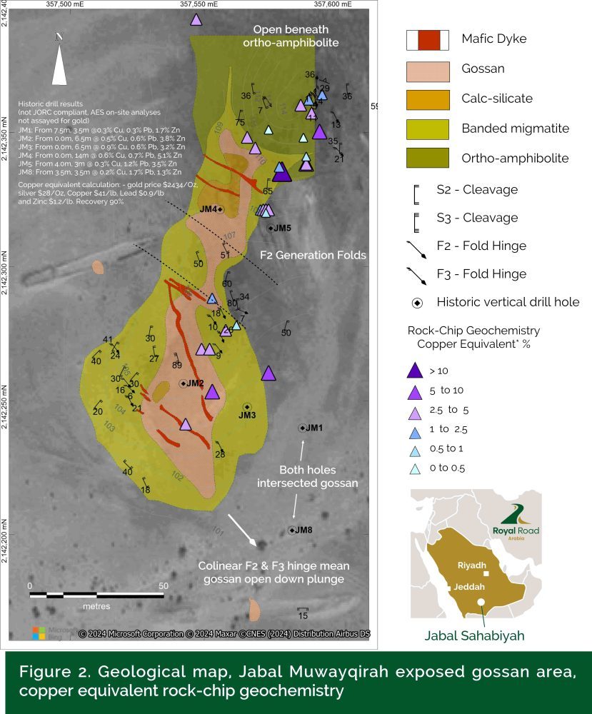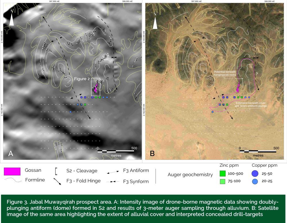 Mapping and new drone-borne magnetic data have revealed that exposed gossan at Jabal Muwayqirah is positioned on the limb of an (F3-generation) antiform (see Figure 3). Auger samples taken from 3 meters below the surface of alluvial sediments have identified subtle zinc and copper anomalism which defines a geochemical trend around the antiform towards its hinge. The geochemistry, structural mapping and magnetic data has highlighted a south-southeast plunging drill-target of approximately 500 meters strike extent and unknown (down-plunge) depth extent (see Figure 3). The gossan also continues beneath overlying metamorphic rocks to the north and may be exposed again around a synform and beneath alluvial cover to the east (see Figure 3). The Company is planning further auger sampling to test this model and has commenced the environmental permitting process for drilling at Jabal Muwayqirah. Drilling is expected to commence in the first quarter of 2025.
