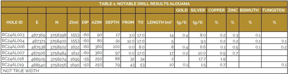 The principal aim of this drilling program was to test for the continuity of shallow-dipping (shear and cleavage parallel) mineralization at depth (see press release, October 23, 2024). A significant thickness of this style of mineralization, combined with the (conjugate northeast and northwest trending) steep-dipping vein-breccia controlled mineralization, would possibly provide a bulk volume significant enough for an open-pit type mining scenario along the Alouana ridge top. Shallow-dipping mineralization did not continue at depth, or significantly away from the immediate vicinity of steeper-dipping vein-breccia style mineralization and the grade and continuity of mineralization intersected within the vein-breccia bodies is not deemed significant enough to support a standalone underground operation. Additionally, gold results returned from sulphide mineralization were low (maximum 0.6 grams per tonne over a meter; RC24AL019 and RC24AL021) and the highest gold intersection in oxide material was 2.2 grams per tonne over a meter (RC24AL022). Highest individual one meter downhole sample results for other metals were, silver 98.3ppm, copper 3.6%, zinc 3.1%, bismuth 0.5% and tungsten 0.6%.