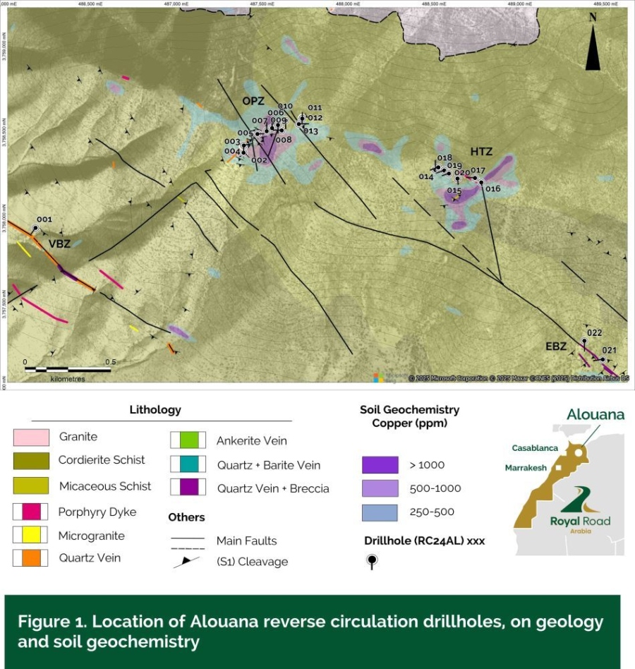 Toronto, Ontario March 10, 2025 - Royal Road Minerals Limited (TSXV: RYR) ("Royal Road" or the "Company") reports geochemical results from its 2000 meter reverse circulation scout drilling program at the Alouana project in Morocco. The Alouana project is subject to an Option Agreement (the “Agreement”; see Press Release, October 17, 2023) between Royal Road Arabia Limited (“RRA”; a Saudi Arabian joint-venture company owned on a 50-50% basis by Royal Road and MIDU Company Limited) and Izughar Resources S.A.R.L (“Izughar”), the Moroccan company holding title to the Alouana licenses. The terms of the Agreement require that upon completion of a minimum 2000 meters of drilling and receipt of all geochemical results, RRA has the one-time option to pay to Izughar the amount of US$750,000 (the “Option Payment”) in exchange for 90% of Izughar (see Press Release, October 17, 2023).