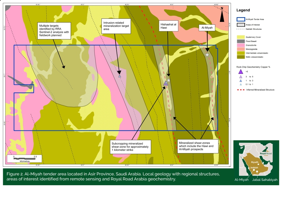 Dr. Tim Coughlin, Royal Road’s President and CEO, stated: “It’s been 45-years since exploration work was conducted at Al-Miyah. Commodity focus and our understanding of exploration geology has changed profoundly since then. Our team have identified immediate copper and gold potential at known historic occurrences and at new prospects throughout the license areas. Saudi Arabia’s vision and proactive support for the mining sector is unparalleled as clearly evidenced by its innovative financial assistance schemes. It is a privilege for our organization to be at the forefront of mineral exploration in the Kingdom at this exciting transformative time”