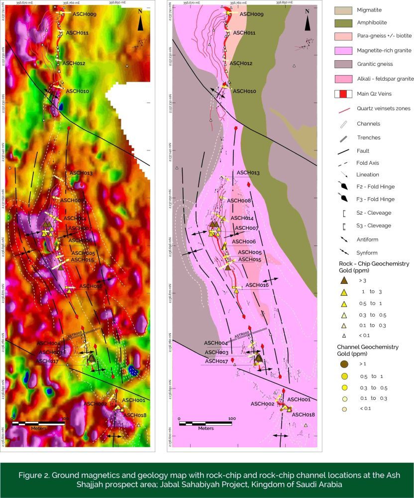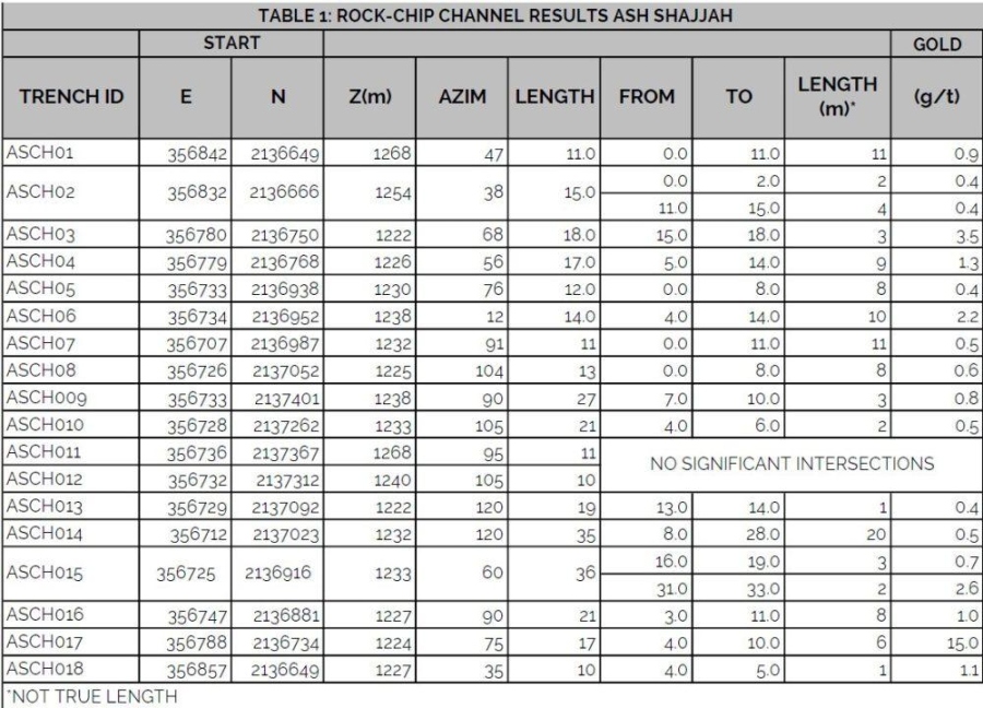Continuous rock-chip channel sampling has expanded on previous results (see Press Release October 6, 2025) and has now extended the footprint of known gold mineralization at Ash Shajjah to more than 800 meters of strike, remaining open both to the north and the south. Selected results include (see Table 1 and Figure 2):