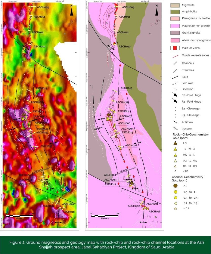 The Ash Shajjah prospect lies within the Company’s Jabal Sahabiyah project in Asir Province, covering three contiguous Exploration Licenses totalling 284 square kilometers (see Figure 1). Gold mineralization occurs within a broadly north–south striking, folded and doubly plunging, sheeted quartz-vein system.