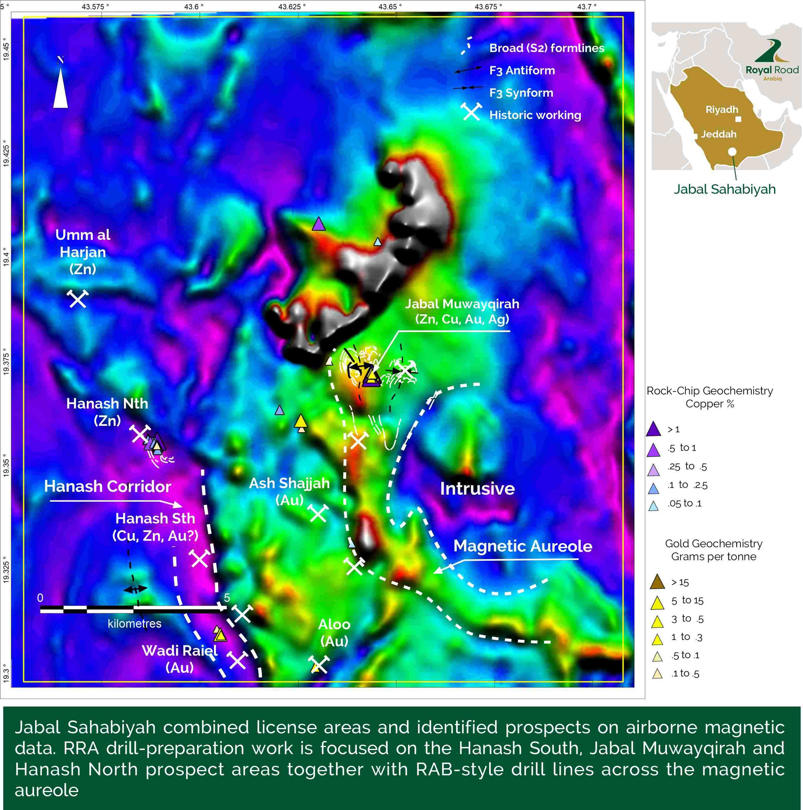 Royal Road Arabia has conducted, detailed mapping, surface geochemistry and drone-borne magnetics surveys across Jabal Sahabiyah and has prioritised three of the