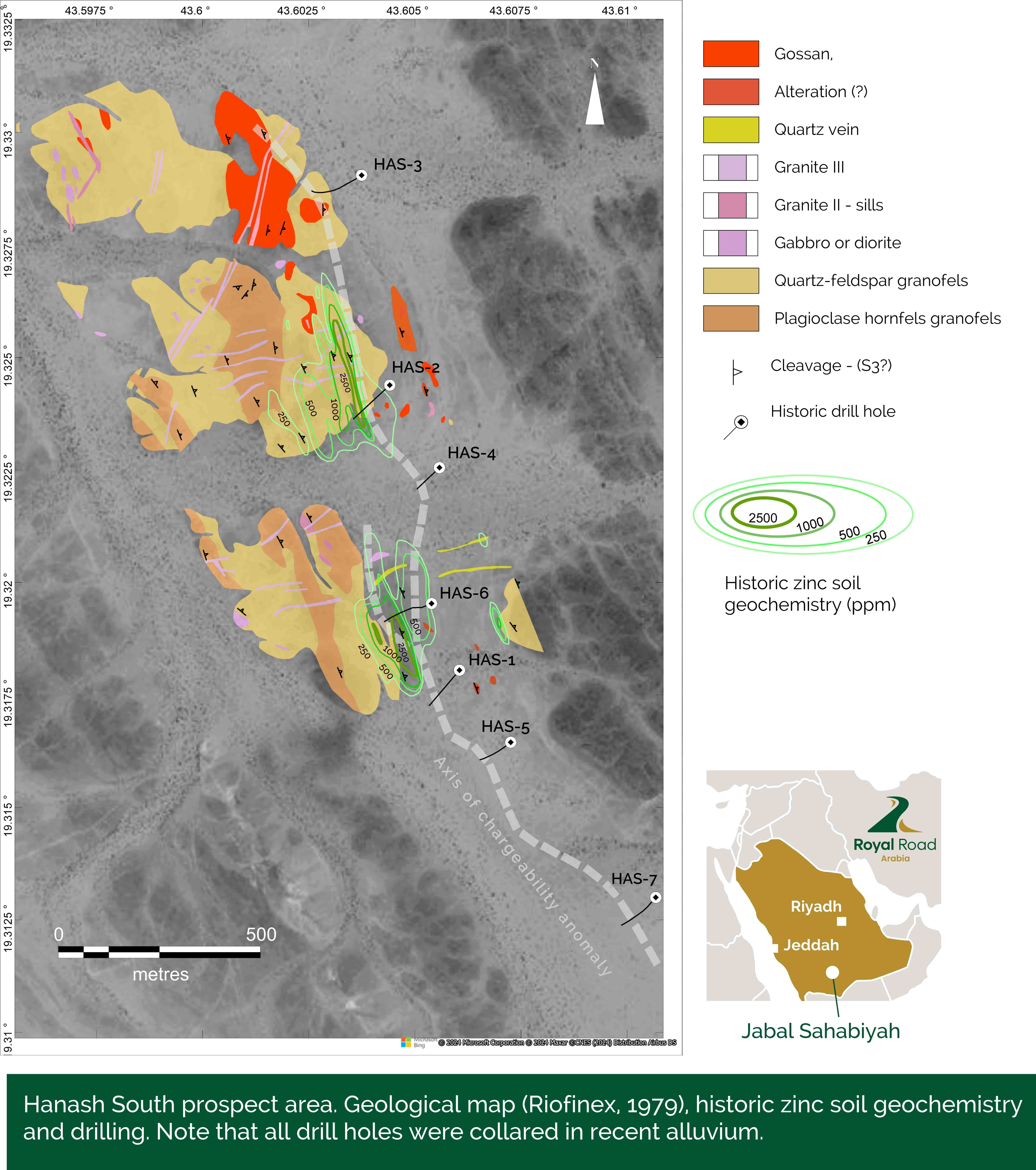 skarn-style prospects, Hanash South, Jabal Muwayqirah and Hanash North for further drilling. Furthermore, mapping and geophysics has identified some target areas concealed under dry river beds and sand for shallow RAB-style drilling in the first half of 2025. Importantly, Riofinex did not systematically analyse for gold, and historic silver and in some cases base metal analyses are repeatedly lower than the results Royal Road Arabia has received from surface sampling (Highest gold 9.3 g/t and highest silver 423ppm from Jabal Muwayqirah).