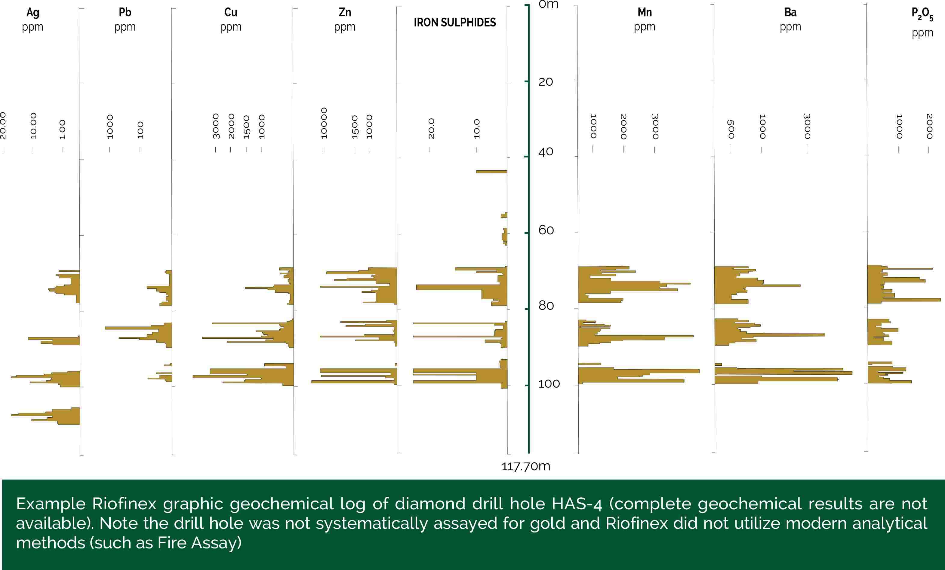 The Hanash South prospect area is of particular interest as Riofinex intersected up to 90 meters (downhole thickness) of blind sulphide material along a 2.3 kilometer strike length. Royal Road will redrill old Riofinex drill holes to test for gold and silver content.